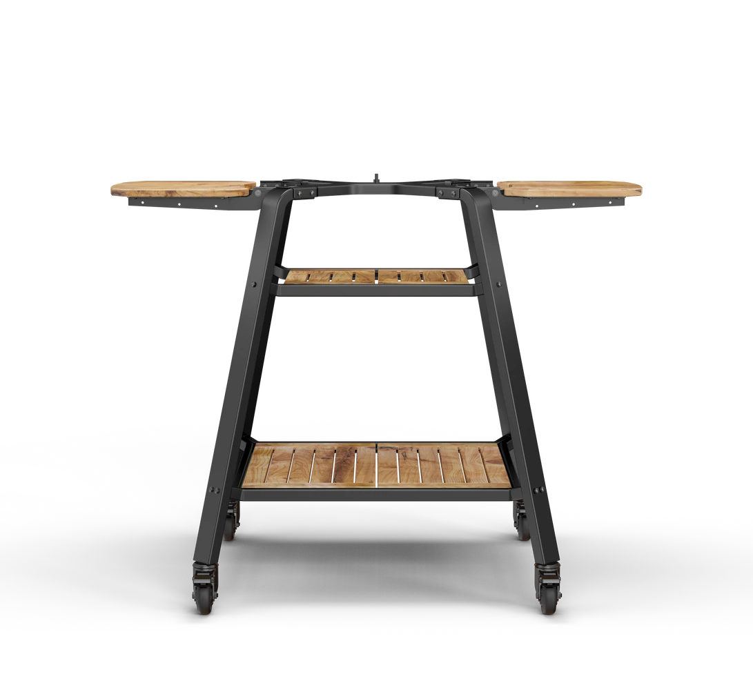 Designed with cooking on the Dome in mind, your oven securely connects to the stand with an easy turn fastener and sits at the perfect height for cooking. The bamboo shelves, hanging hooks and adjustable wings are built in for convenience while the four large wheels make it easy to move your oven around your backyard.