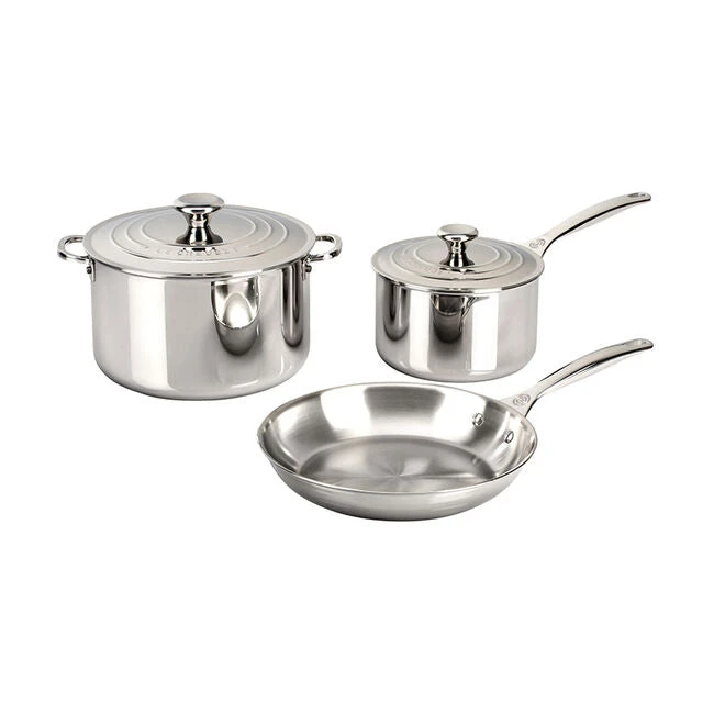 The 5-piece Stainless Steel set is crafted by European artisans with a refined performance-driven design to master any culinary challenge, and includes the essentials needed in every kitchen. Radiant and durable, the triple layer construction features a full base-to-rim aluminum core for superior heat distribution, while the lightweight titanium-infused stainless steel exterior resists scorching and corrosion. Innovative details such as interior capacity markings, iconic three-ring lid with built-in steam vents, and a dripless pouring rim save valuable prep time and make cleanup a breeze.