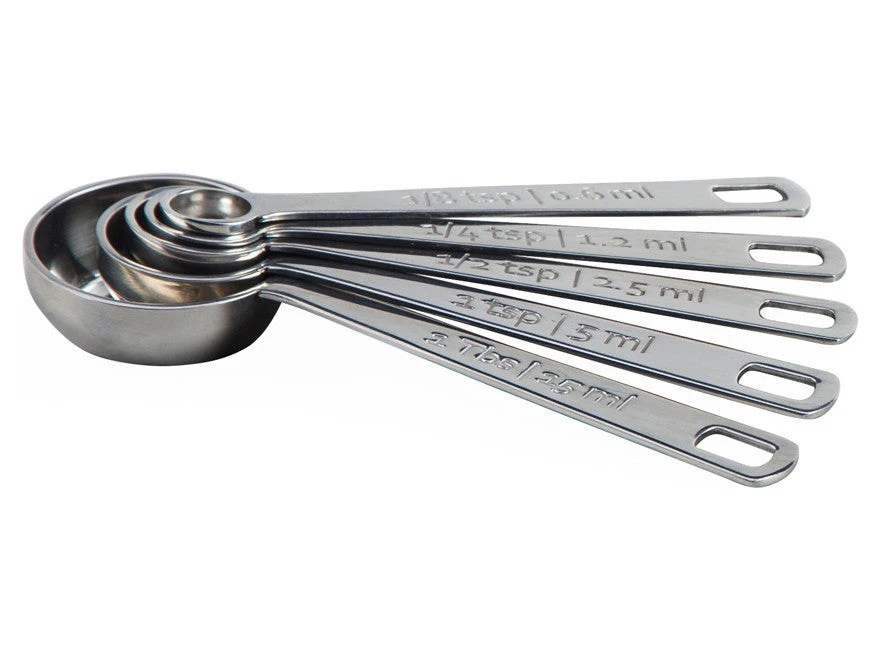 A must for any working kitchen, these stylish measuring spoons are crafted from high-quality materials and perfectly complement any collection of Le Creuset stainless steel cookware. Five spoons measure 1/8 tsp, 1/4 tsp, 1/2 tsp, 1 tsp and 1 tbsp.