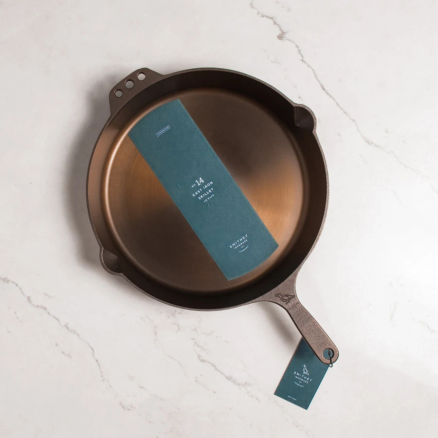 The newest and largest addition to Smithey’s line of traditional skillets, the No. 14 knows no bounds when it comes to cooking for a crowd. Reflecting our iconic cast iron skillet design, the No. 14 has a larger surface area so you can go from searing multiple cuts of steak to sautéing a dinner’s worth of vegetables. This skillet is at home wherever there is heat. From oven to grill, or stovetop to campfire you can rest assured that this extra-large skillet will become your go-to vessel for large quantity cooking. Complete with Smithey’s signature polished interior finish, the No. 14 when seasoned is naturally non-stick and free of chemical coatings. Designed to fit with our custom 14″ glass lid which is offered for purchase separately.Â